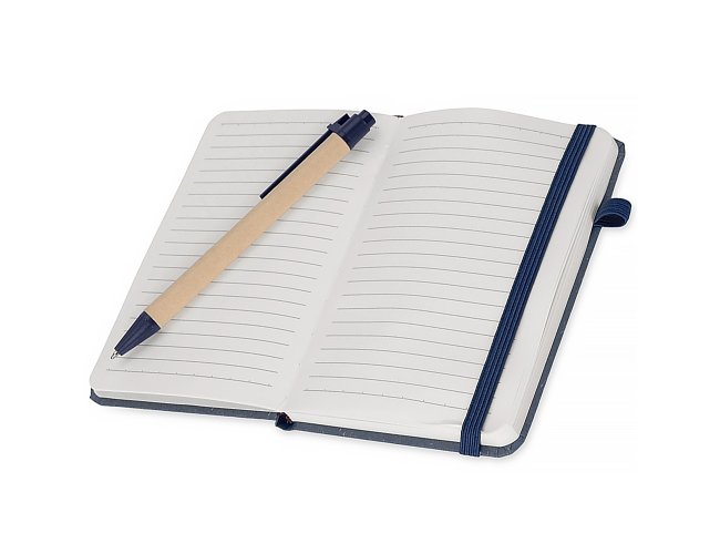 Caderneta Personalizada Ecológica com Caneta XV8288: capa dura revestida em fibra de palha de trigo, cerca de 80 folhas pautadas e duas folhas de guarda. Traz fita para fechamento e porta-canetas elástico para manter tudo no lugar. Acompanha caneta esferográfica azul 1,0 mm com corpo em papelão, clipe e acionamento por clique — combinação prática para o dia a dia.