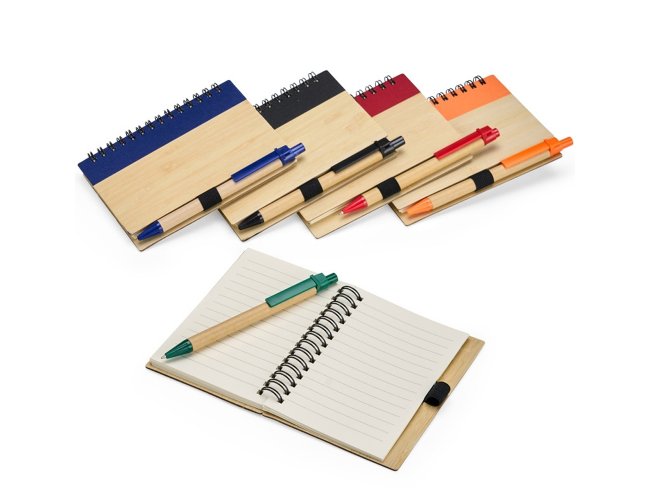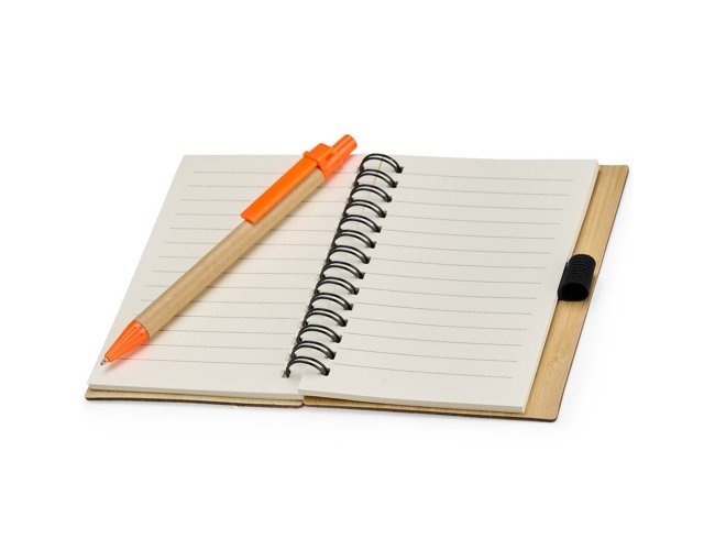 Caderno ecológico XV18937 com capa em casca de bambu e faixa colorida. Possui aproximadamente 70 folhas amareladas pautadas, encadernação Wire-O e elástico para caneta. Acompanha caneta esferográfica azul de 0,8mm com corpo em papelão e acionamento por clique. Brinde sustentável e elegante para valorizar sua marca.