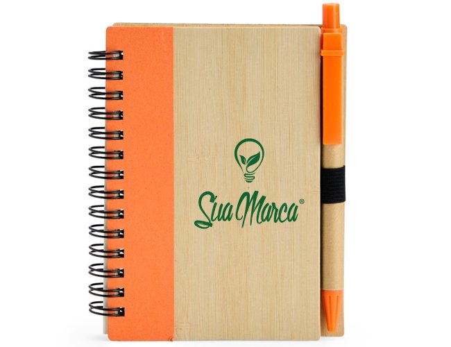 - Material Sustentável: Capa de bambu e caneta ecológica, reforçando a imagem verde da sua marca.