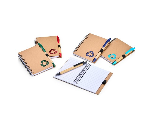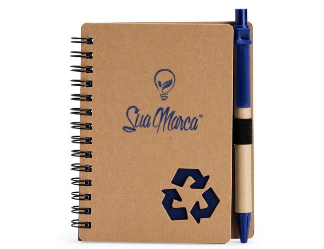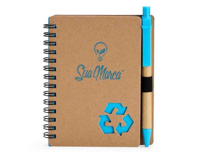 Caderno de capa dura em papelão com detalhe vazado em formato do símbolo da reciclagem, elástico porta-caneta, encadernação Wire-O e cerca de 70 folhas pautadas brancas. Acompanha uma caneta esferográfica de carga azul de 1,0 mm com corpo em papelão e clip, acionamento em clique e ponteira em plástico.