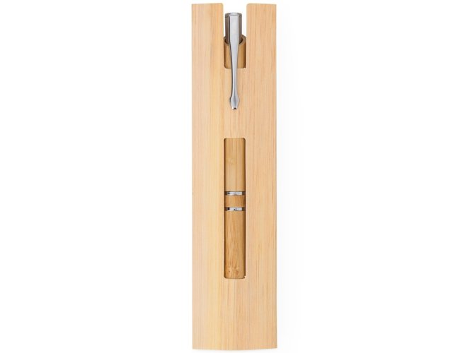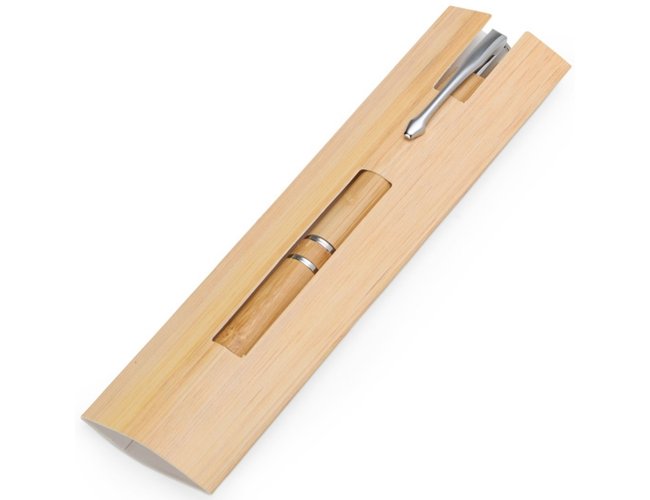 Caneta ecológica personalizada XV8250 com corpo em bambu, clipe metálico e acionamento por clique. Carga esferográfica azul 1.0mm para escrita suave. Acompanha estojo de papel com estampa que imita bambu, unindo sustentabilidade, elegância e praticidade em um brinde corporativo exclusivo e responsável.