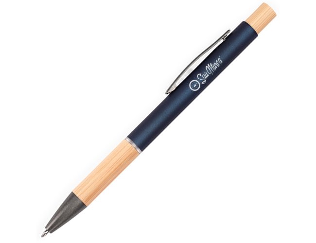 Caneta personalizada XV8187 com corpo metálico e detalhes em bambu, acionamento por clique e carga esferográfica azul 1.0mm. Oferece pegada leve e escrita precisa, unindo sofisticação e sustentabilidade. Brinde elegante e funcional para empresas que valorizam qualidade e design sustentável.