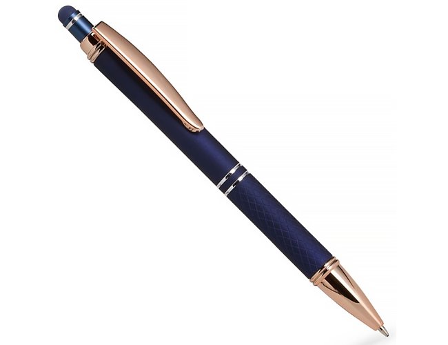 Caneta Personalizada de Metal Ponta Touch XV5020A: corpo metálico com detalhes texturizados para melhor pegada, acionamento por clique com acabamento emborrachado e tinta azul 1,0 mm para escrita suave. A ponta touch permite interagir com telas sensíveis ao toque com precisão e sem marcas.