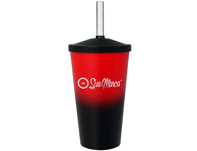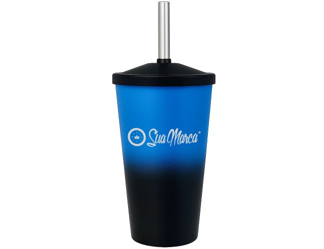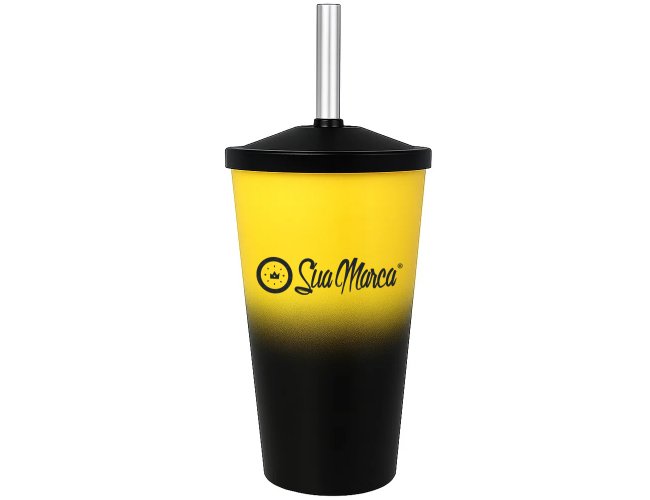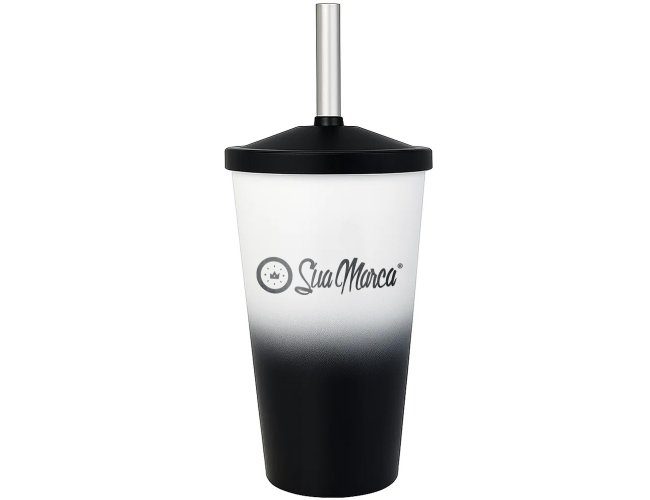 Copo Personalizado de 700ml GV029 com tampa e canudo. Fabricado em polietileno com pintura jateada bicolor, é ideal para eventos corporativos, ações promocionais e brindes personalizados. Prático, resistente e com ampla área para gravação da sua marca.