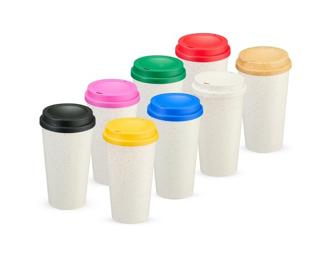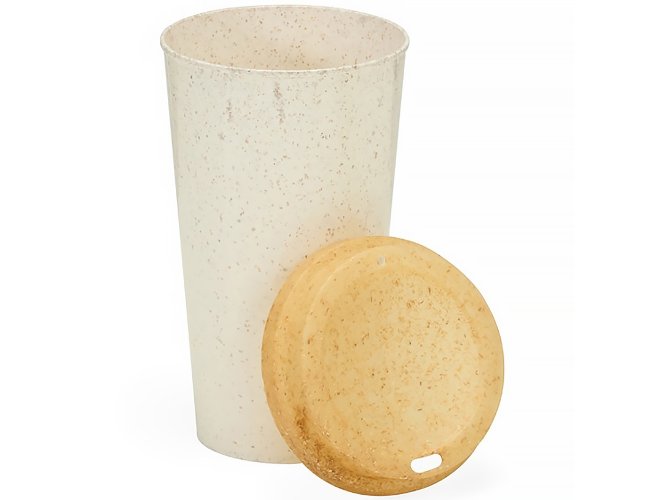 Copo em fibra de arroz com capacidade de até 550ml. Possui tampa protetora com bocal.