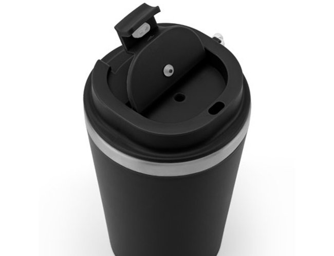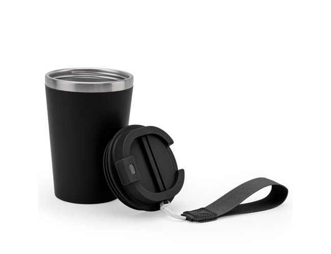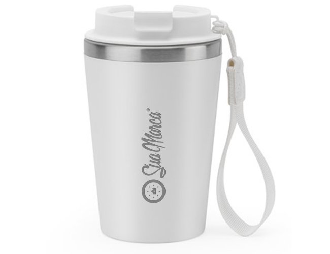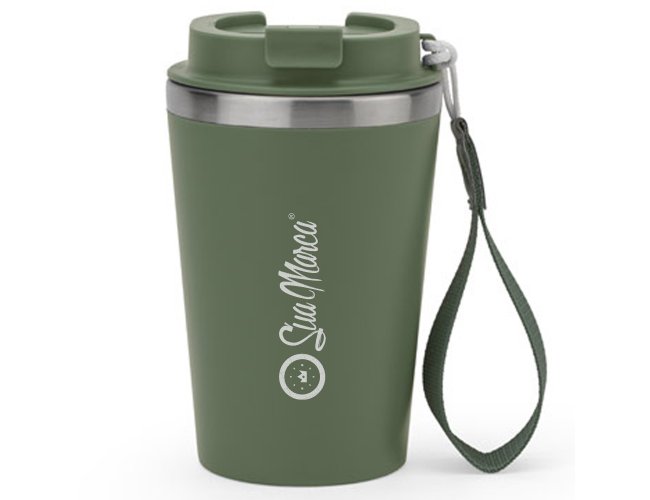 Copo Térmico Personalizado de Inox 450 ml SV94377: combina PP e aço inox 90% reciclado com parede dupla e acabamento fosco (mate) para manter a temperatura por mais tempo. A tampa em PP é à prova de vazamento e traz alça/pega integrada em PU e PET para levar com facilidade. Acompanha caixa-presente em papel kraft reciclado.