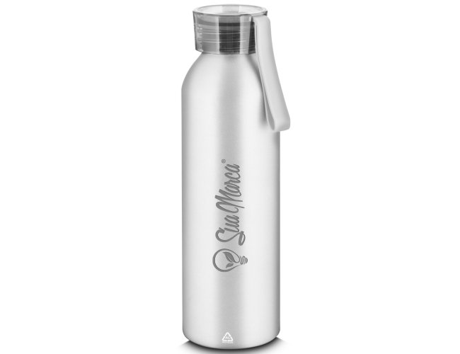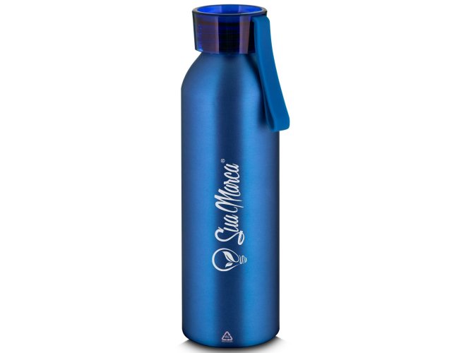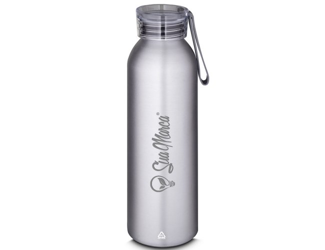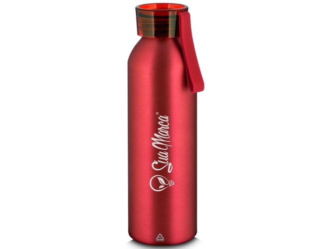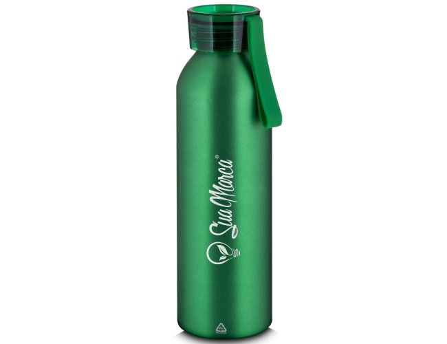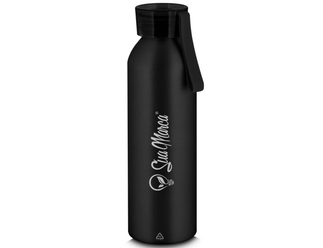 Garrafa personalizada de alumínio reciclável com capacidade de 640ml, ideal para brindes corporativos sustentáveis. Conta com tampa rosqueável de plástico e alça emborrachada para fácil transporte. Produto durável e ecológico, perfeito para fortalecer a imagem da sua empresa em eventos e campanhas promocionais.