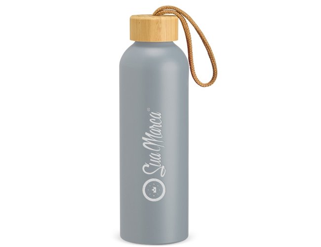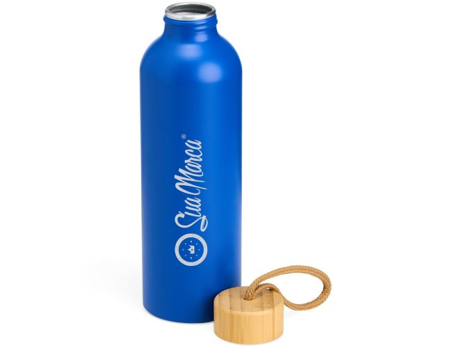 Garrafa Personalizada de Alumínio 800ml XV18940, confeccionada em alumínio com capacidade máxima de 800ml. Possui tampa rosqueável em bambu com alça de algodão para facilitar o transporte. MEDIDA: Altura: 23,5 cm X Largura: 7 cm X Circunferência: 23 cm. Peso aproximado (g): 111