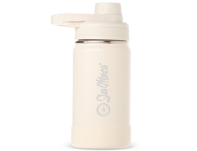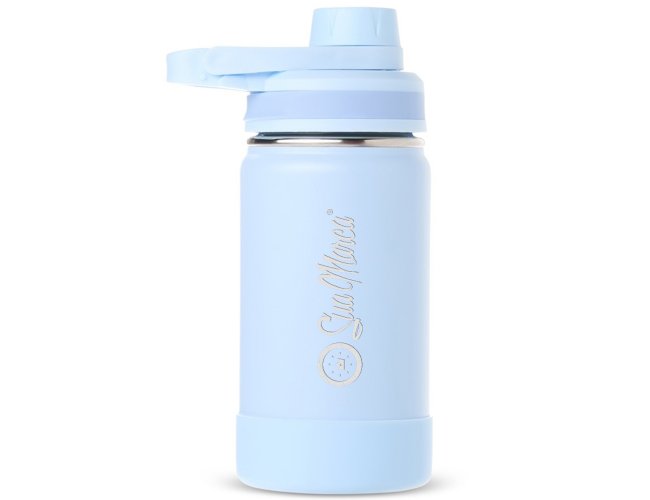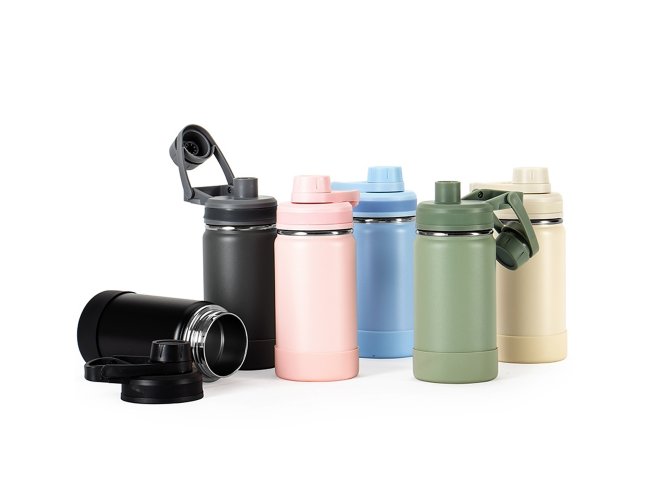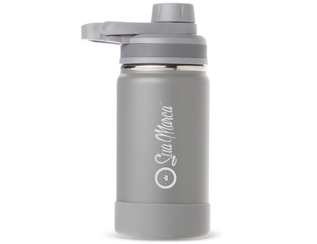Garrafa térmica personalizada confeccionada em aço inox, pintura eletrostática e capacidade para até 350ml. Conta com estrutura de parede dupla e vedação a vácuo, permitindo conservar a temperatura de líquidos por mais tempo. Possui tampa rosqueável com protetor para o bocal e alça fixa para facilitar o transporte. Acompanha protetor para a base em silicone.
