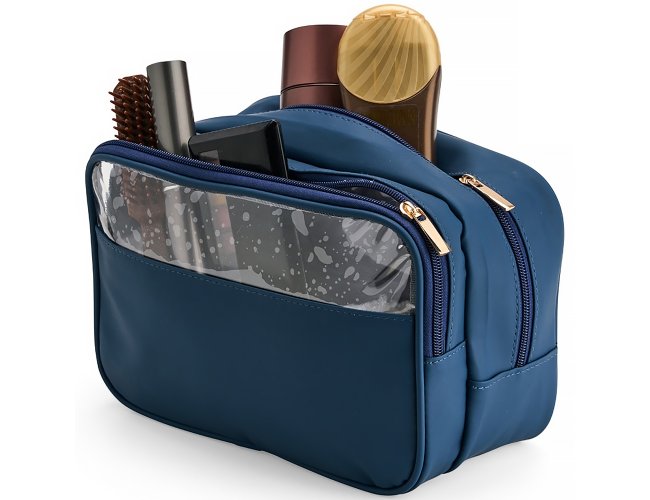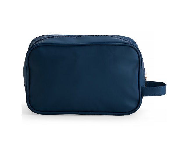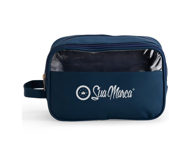 Nécessaire Personalizada com Dois Bolsos XV19040, confeccionada em filme sintético de poliuretano impermeável. Possui dois bolsos no compartimento interno principal, sendo um com fechamento em zíper e outro em tela de nylon. Dispõe ainda de compartimento frontal com viseira e revestimento interno em PVC, ideal para guardar itens molhados. MEDIDA: Altura: 16 cm X Largura: 25 cm X Profundidade: 10 cm. Peso aproximado (g): 229