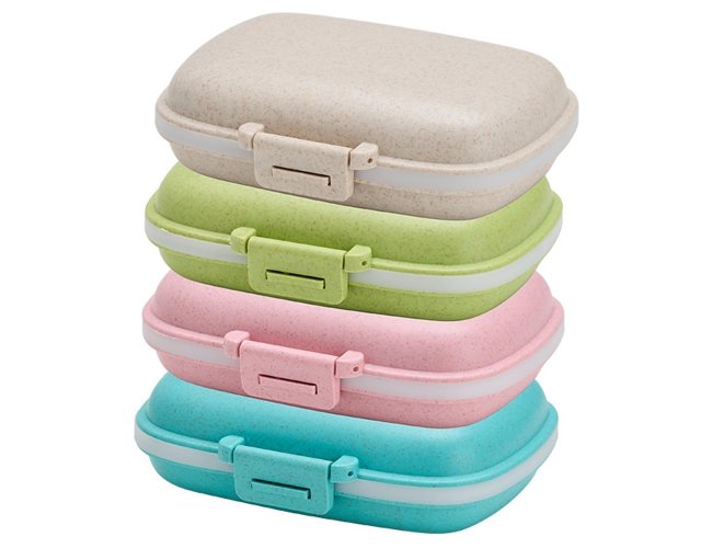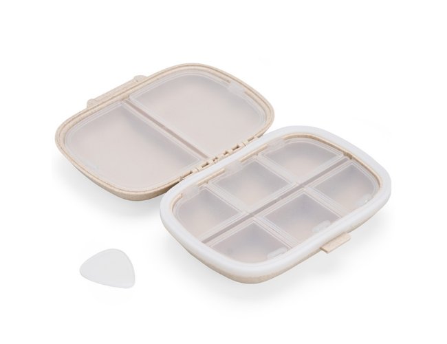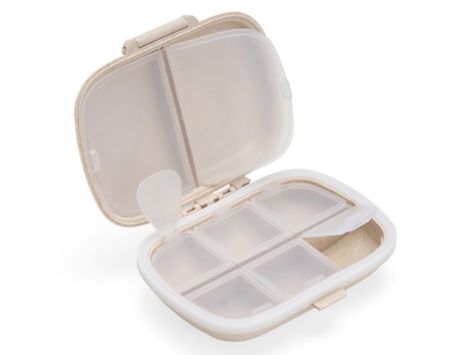 Porta Comprimidos Personalizado de Plástico XV8282, confeccionado em plástico obtido da palha de trigo e anel de vedação para as bordas em silicone. Possui oito compartimentos com tampas removíveis, sendo dois maiores com capacidade de até 30ml e seis menores com até 10ml cada. Acompanha palheta multiuso. MEDIDA: Largura : 8,6 cm X Comprimento : 11 cm X Espessura : 3,6 cm. Peso aproximado (g): 72.