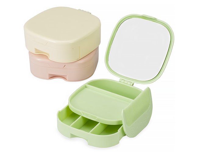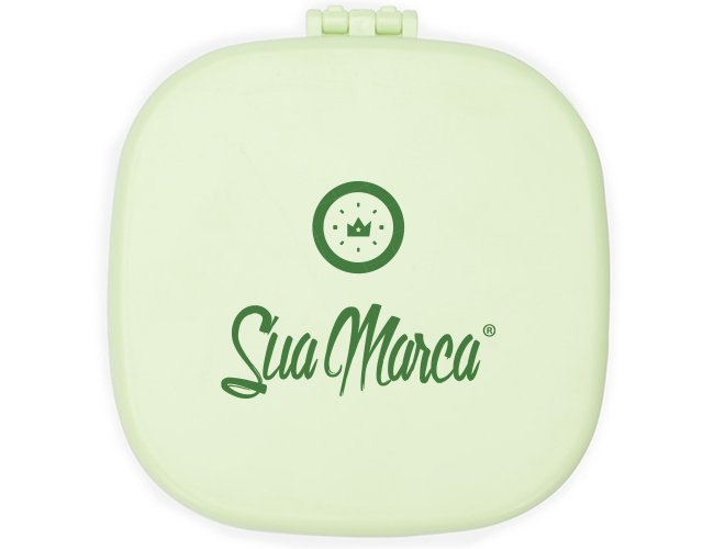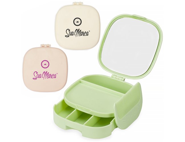 Porta Jóias Personalizado com Espelho XV18984, confeccionado em plástico com espelho sem aumento na parte interna da tampa. Possui compartimentos internos de tamanhos variados e uma gaveta com três divisórias. Acompanha um pente compacto para cabelos. MEDIDA: Altura: 3,5 cm X Largura: 9,9 cm X Comprimento: 9,9 cm. Peso aproximado (g): 133