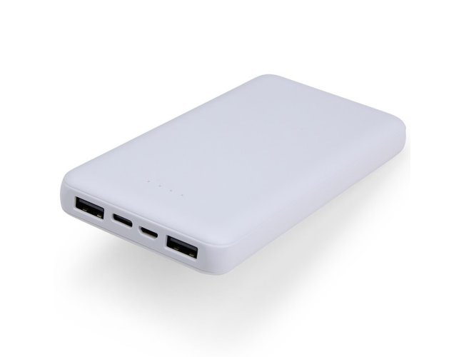Power Bank Personalizado XV08188 com 10.000 mAh, ideal para empresas que desejam um brinde funcional e moderno. Possui 4 entradas (2 USB, 1 Micro USB, 1 USB-C), indicador de LED e botão lateral. Alta performance com entrada e saída 5V=2.1A para recarga rápida de smartphones. Não acompanha cabo USB.