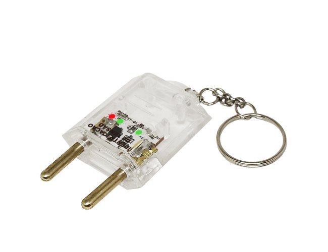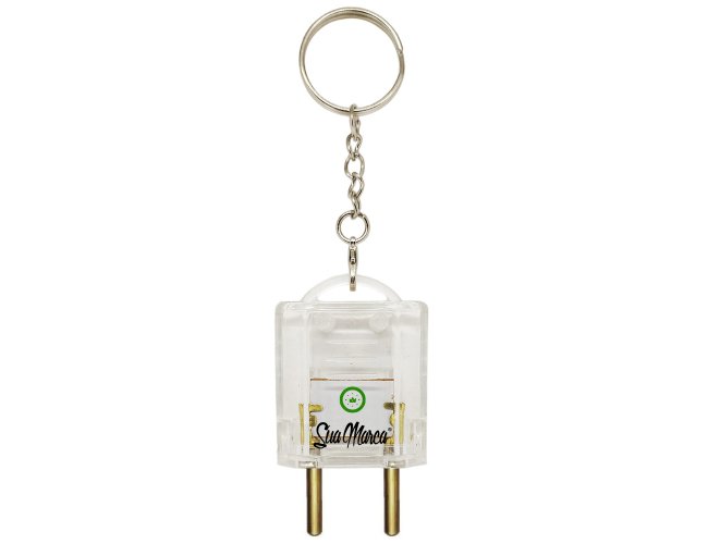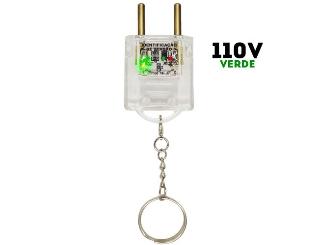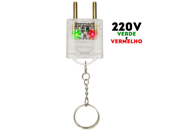 Chaveiros personalizados em formato de tomada, feitos em plástico policarbonato transparente com argola de metal. Indicador de tensão prático: verde para 127V e verde+vermelho para 220V. Ideal para profissionais e empresas, esse chaveiro portátil facilita a identificação rápida e segura da tensão elétrica em ambientes residenciais e comerciais.